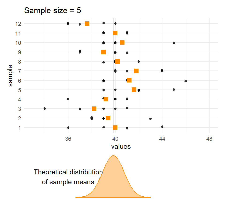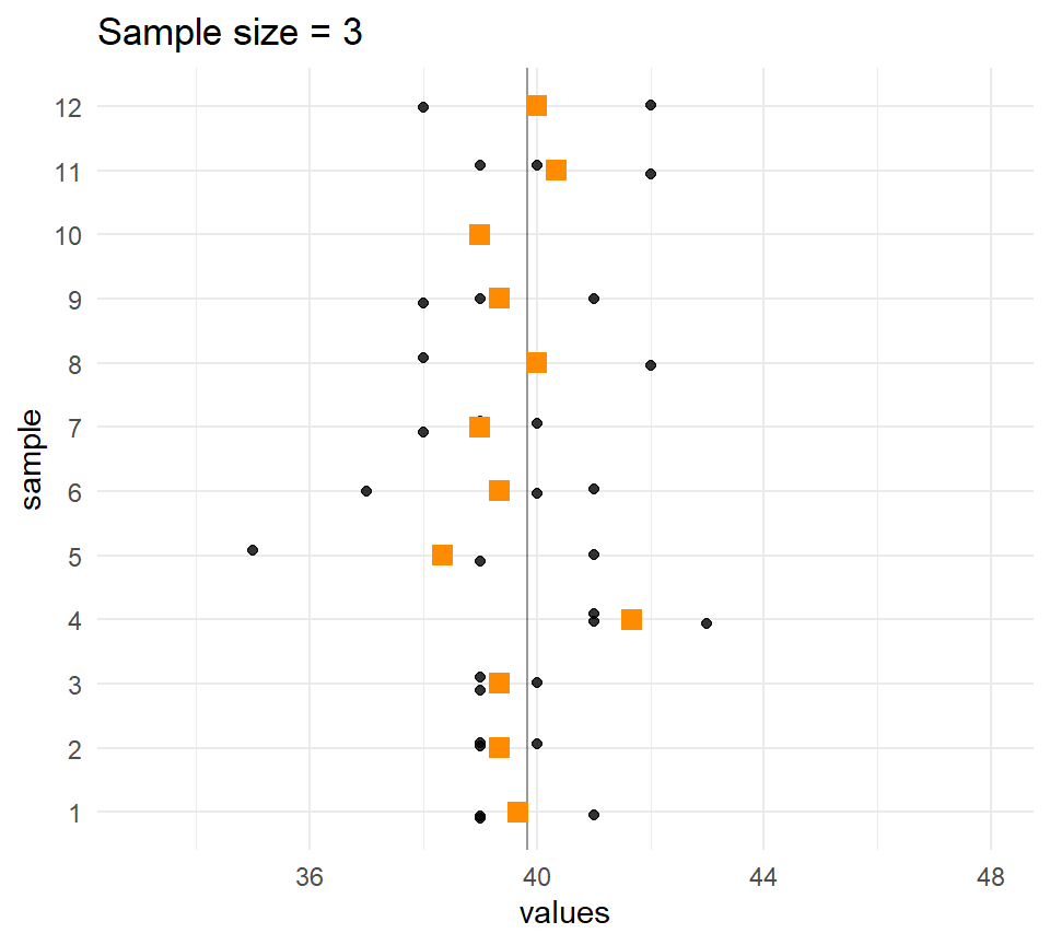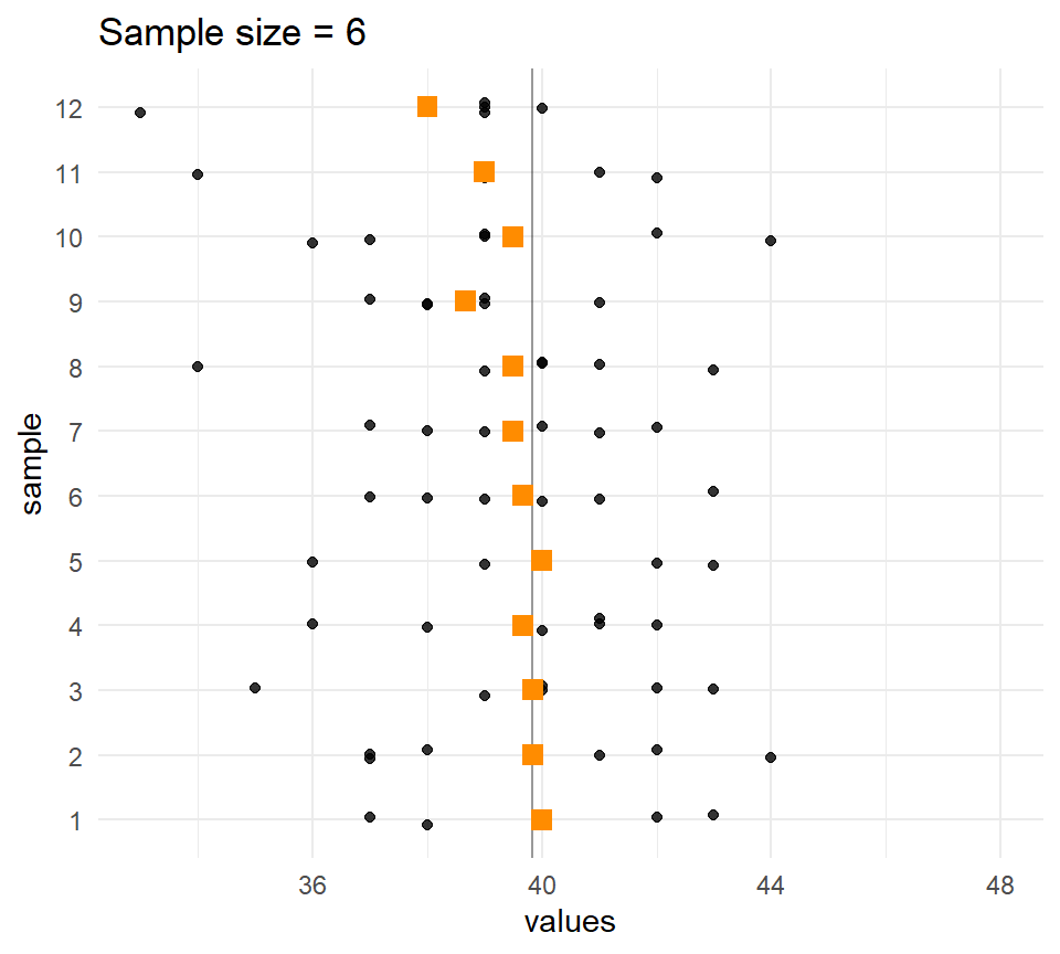 Every soldier was measured so we can treat this as the population, and \(\mu\) = 39.83 and \(\sigma\) = 2.05 as population parameters. Let’s take some samples of size \(n\) = 6 from this population.