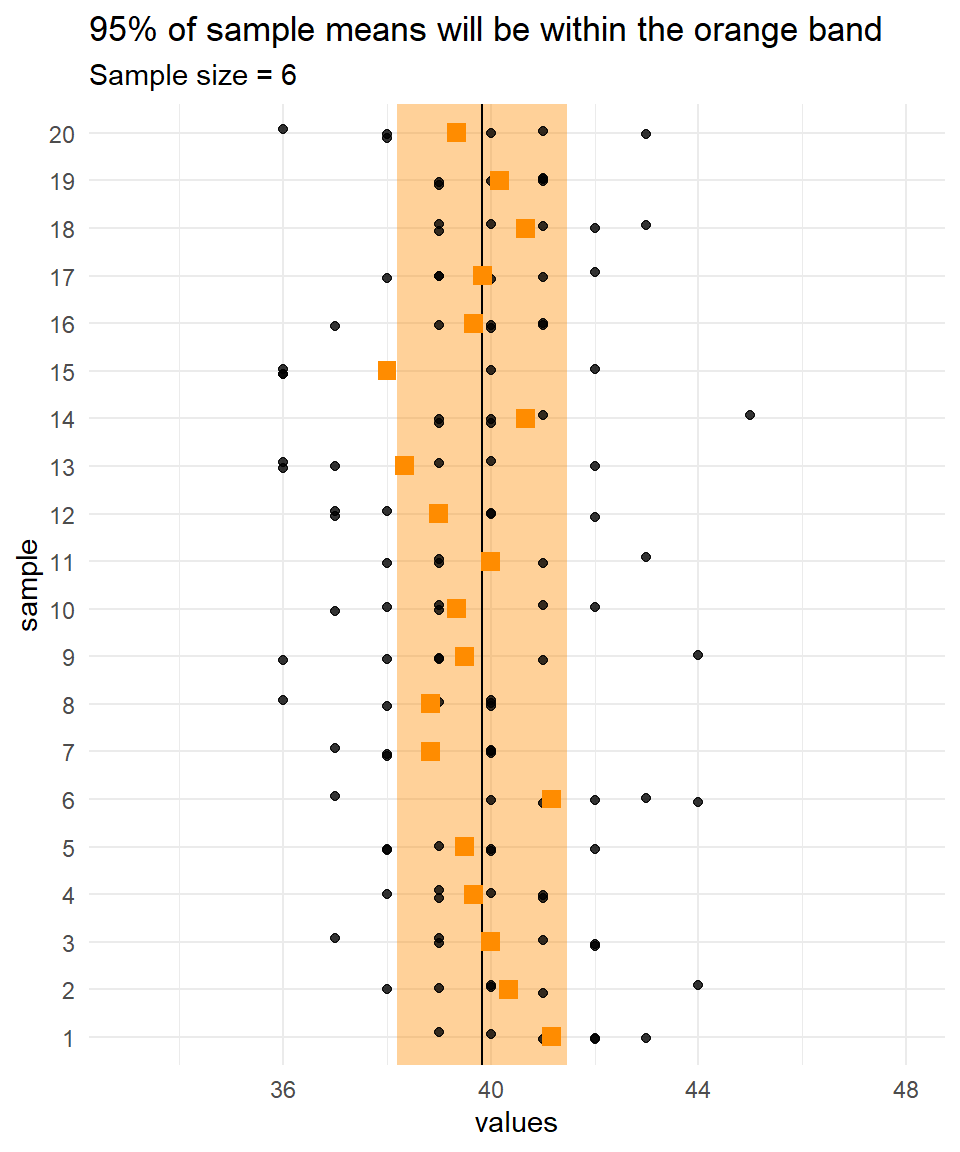 For example, for samples of size 6 from the Quetelet dataset, 95% of means will lie within \(39.83 \pm 1.96\times 2.05 / \sqrt 6\),