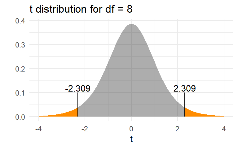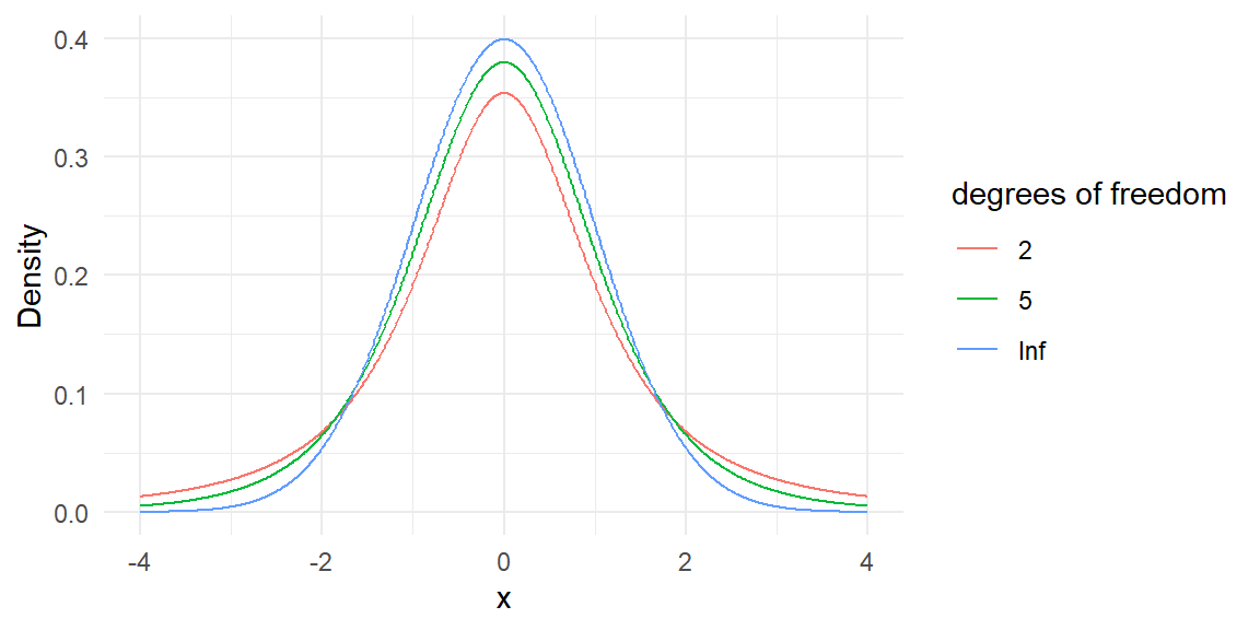 The t distribution is not just a single distribution. It is really an entire series of distributions which is indexed by something called the “degrees of freedom” (or \(df\)).