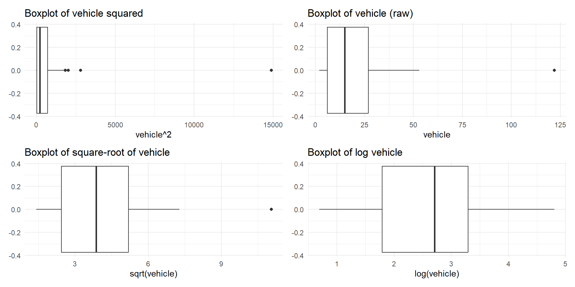 Right skewed distribution is made roughly symmetric using a log transformation for no. of vehicles variable (rangitikei.* dataset)