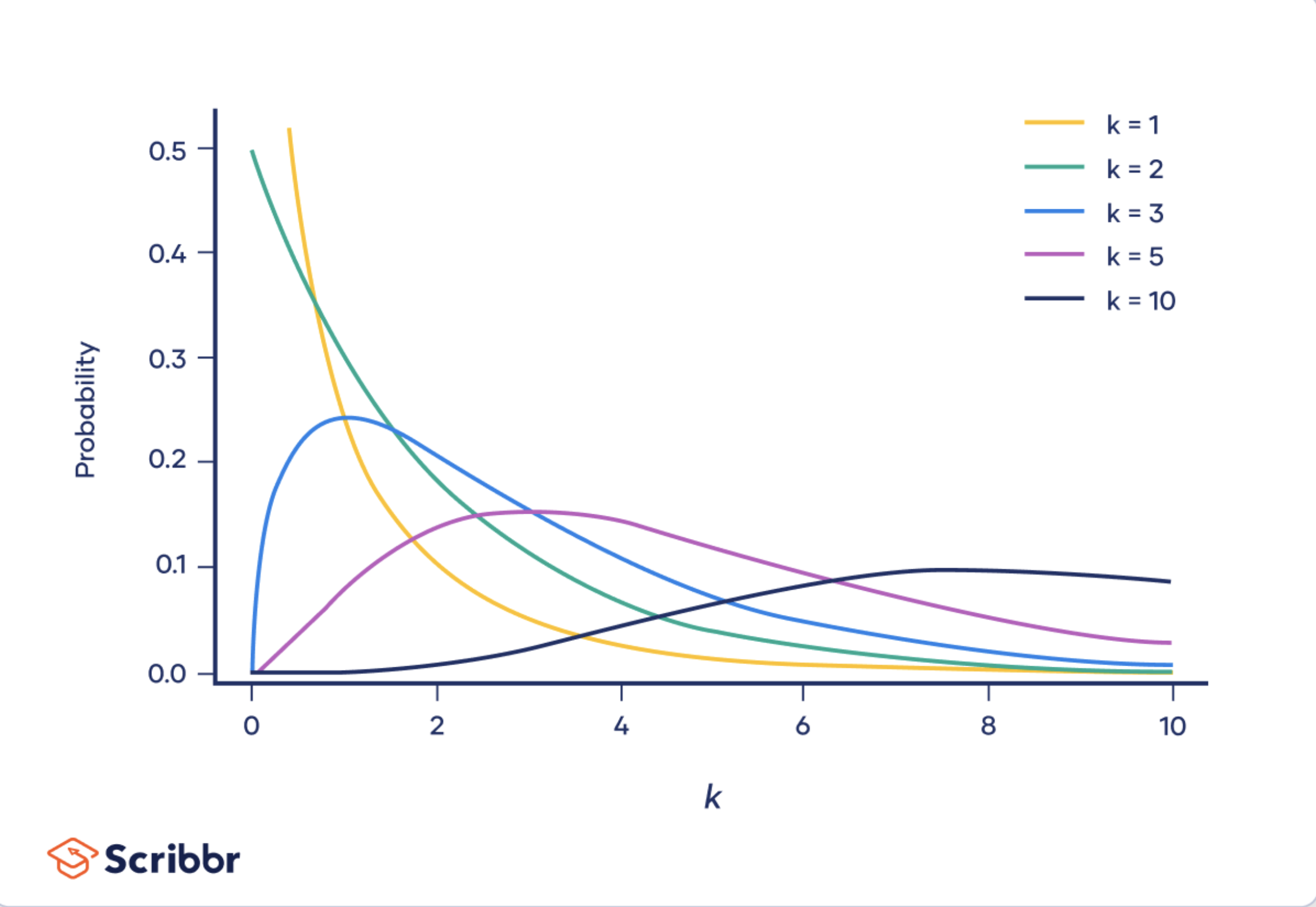 Shape of the \(\chi ^ 2\) distribution is determined by the degrees of freedom (k), at very high k (90 or greater) \(\chi ^ 2\) distribution resembles the normal distribution