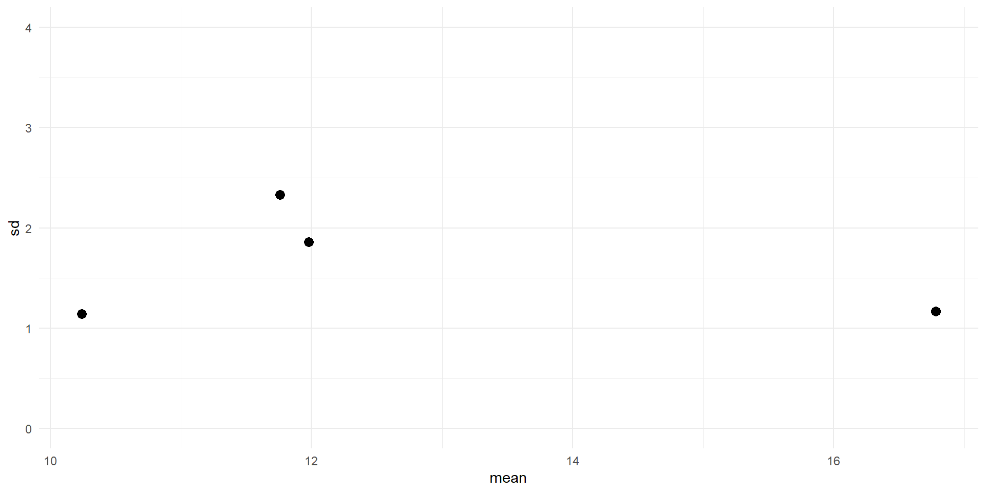 If the assumptions were valid, we would expect the four points to fall approximately along a horizontal band indicating constant standard deviations, and hence variances, regardless of the means of the groups.