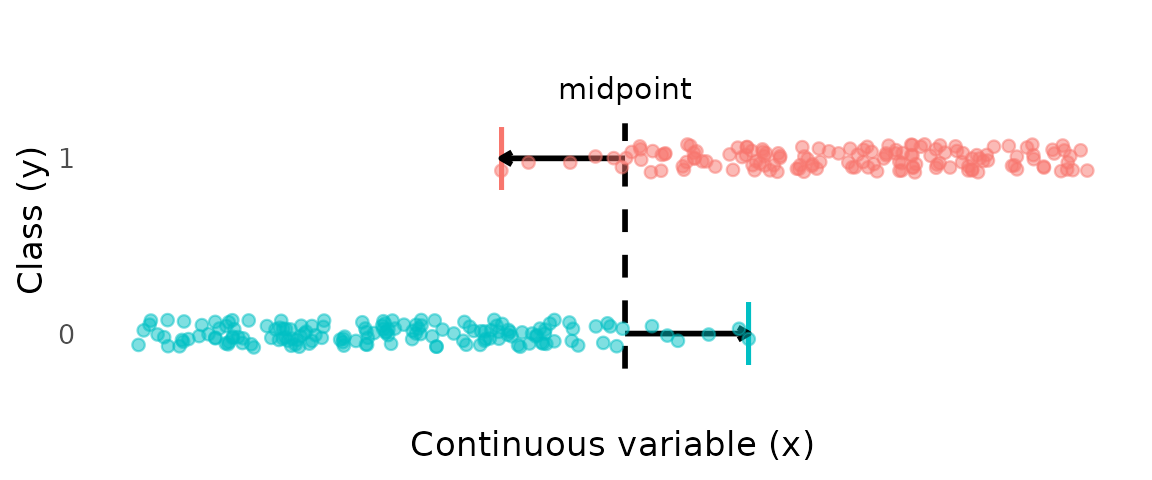 The generative classifier approach has the advantage of being less sensitive to class imbalance, since the transition point estimate depends on the shapes of the class distributions, not their relative sample sizes. This is achieved by fitting a density to each class separately, and then calculating the transition point based on the relative densities of the two classes. Linear Discriminant Analysis (LDA) is a widely used generative classifier that fits a Gaussian (Normal) density to each class.