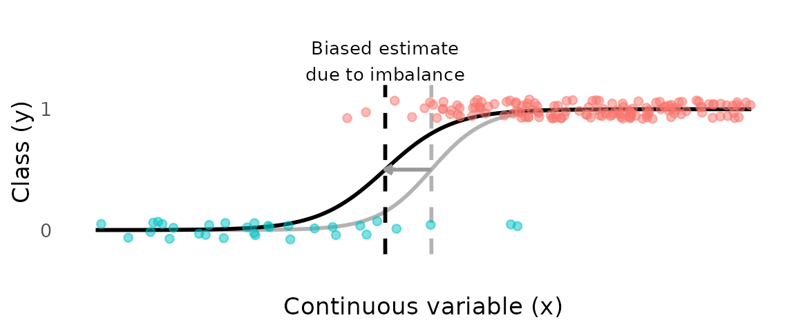 In the plot below, 85% of the class 0 observations have been removed, resulting a highly imbalanced dataset and a biased estimate of .