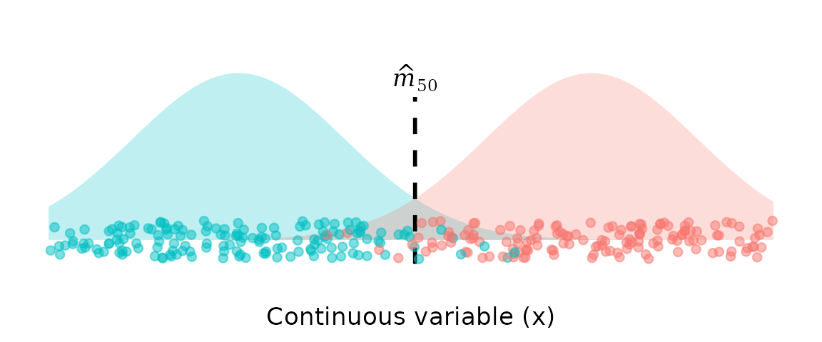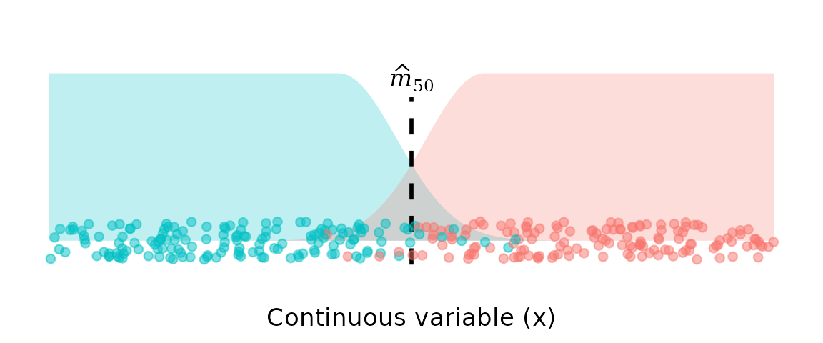 In maturity studies, this point might be called “length at 50% maturity”. To the left of , class 0 is more likely; to the right of , class 1 is more likely.